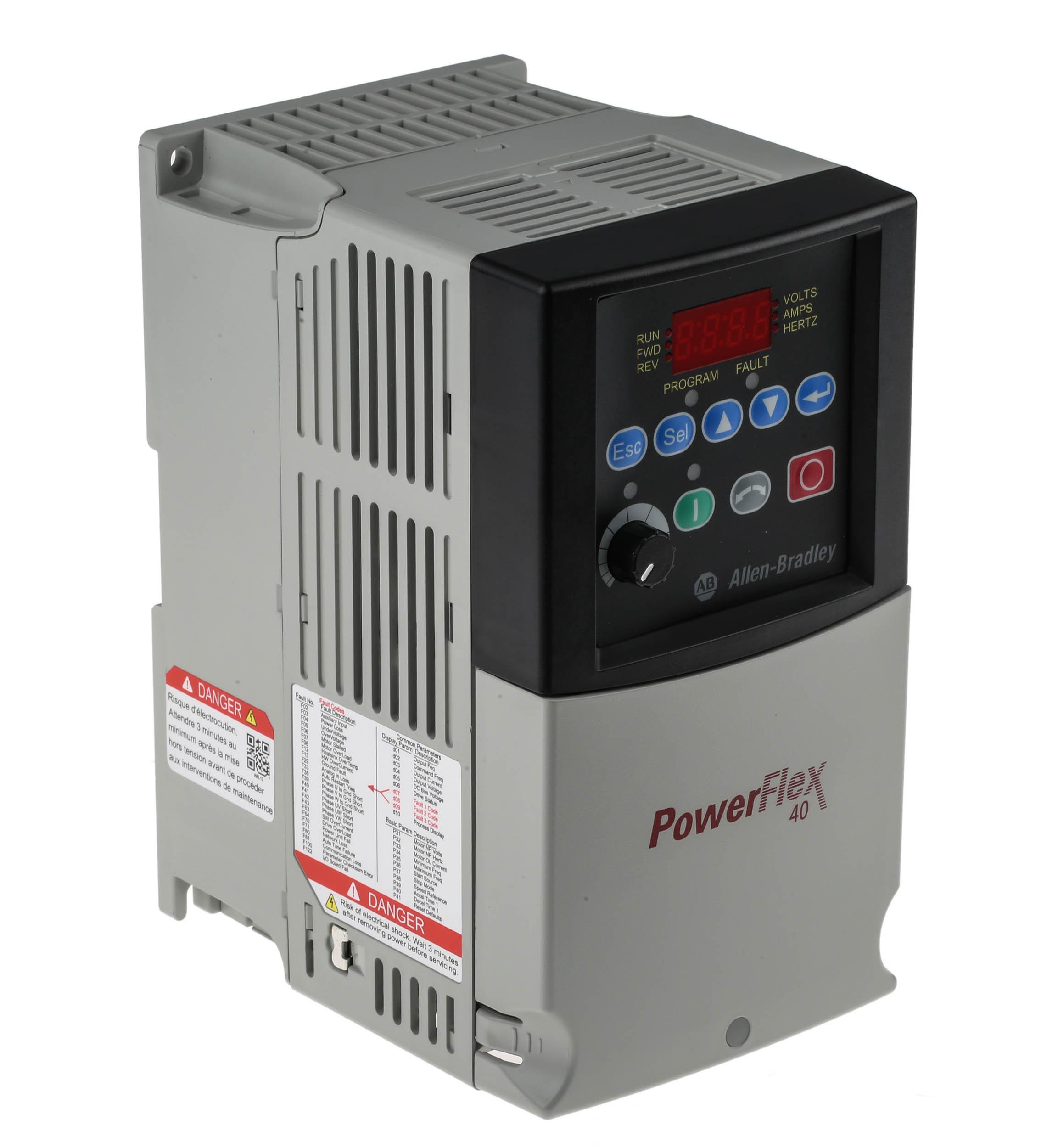 ALLEN BRADLEY 22BD010N104 POWERFLEX 40 5HP 480V 400HZ AC. Documents & Guides Cut Sheet Owners Manual Quick Start Guide Technical Bulletin Drive, PowerFlex 40, 380 - 480 Volt AC, 3-Phase, 4 kW, 5 Horse Power, 10.5 Amp, B Frame, No Filter, IP20 Open. The 22B-D010N104 has a flying start, drive overload protection, and ramp regulation.
